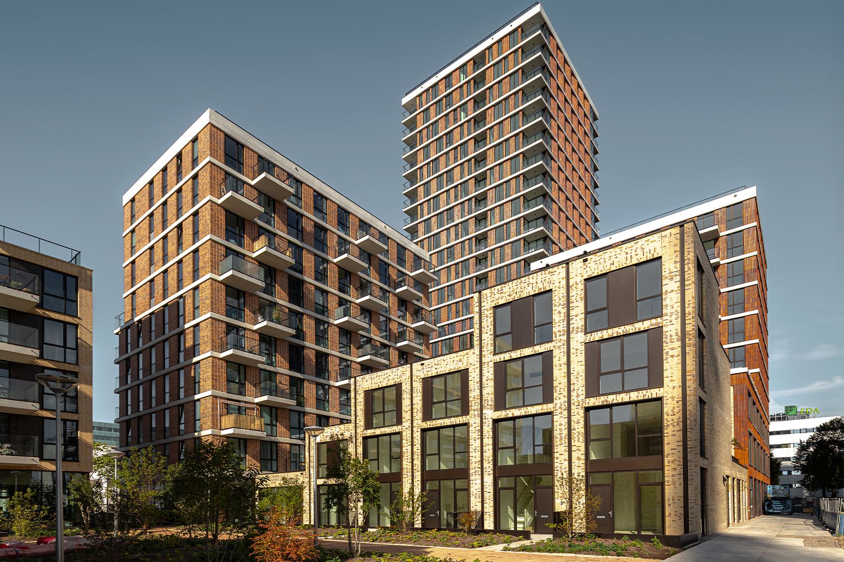 De drie componenten vormen een ensemble door de aangename gevlekte gele steen, die wordt doorsneden door horizontale betonnen banden met een bamboe-afdruk. Doordat deze betonbanden naar voren komen, ontstaat ruimte voor expressieve balkons. De kozijnen zijn champagnekleurig. De balkons springen bij het blok aan de Pampuslaan door hun V-vorm naar binnen, zodat een levendig gevelbeeld is ontstaan.
