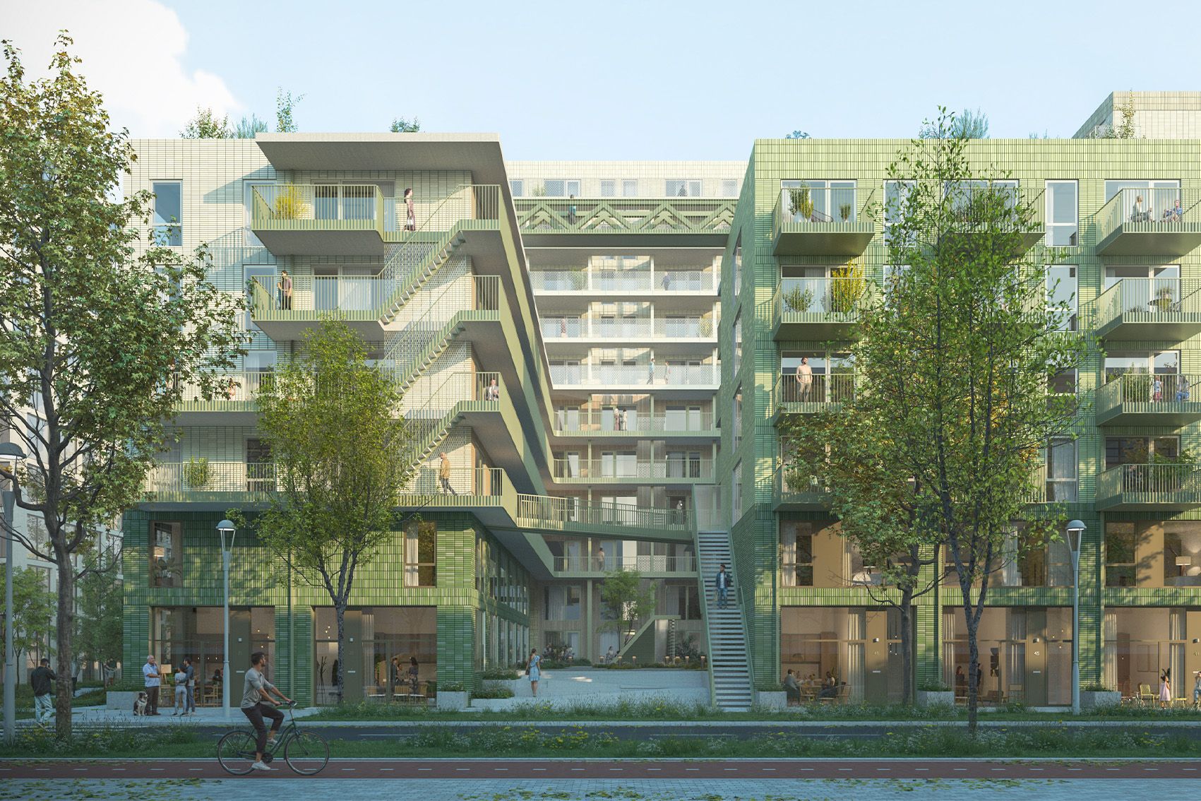 Op de voormalige parkeerplaats ontwierpen we een patiogebouw met 160 woningen. De hap uit het rechthoekige gebouw (die nu als voorplein dient en de ingang markeert) is de ‘fantoomvorm’ van een inmiddels verdwenen supermarkt. We ontwierpen een gebouw met twee gezichten: buiten opgeruimd en opgepoetst, binnen informeel en gezellig.