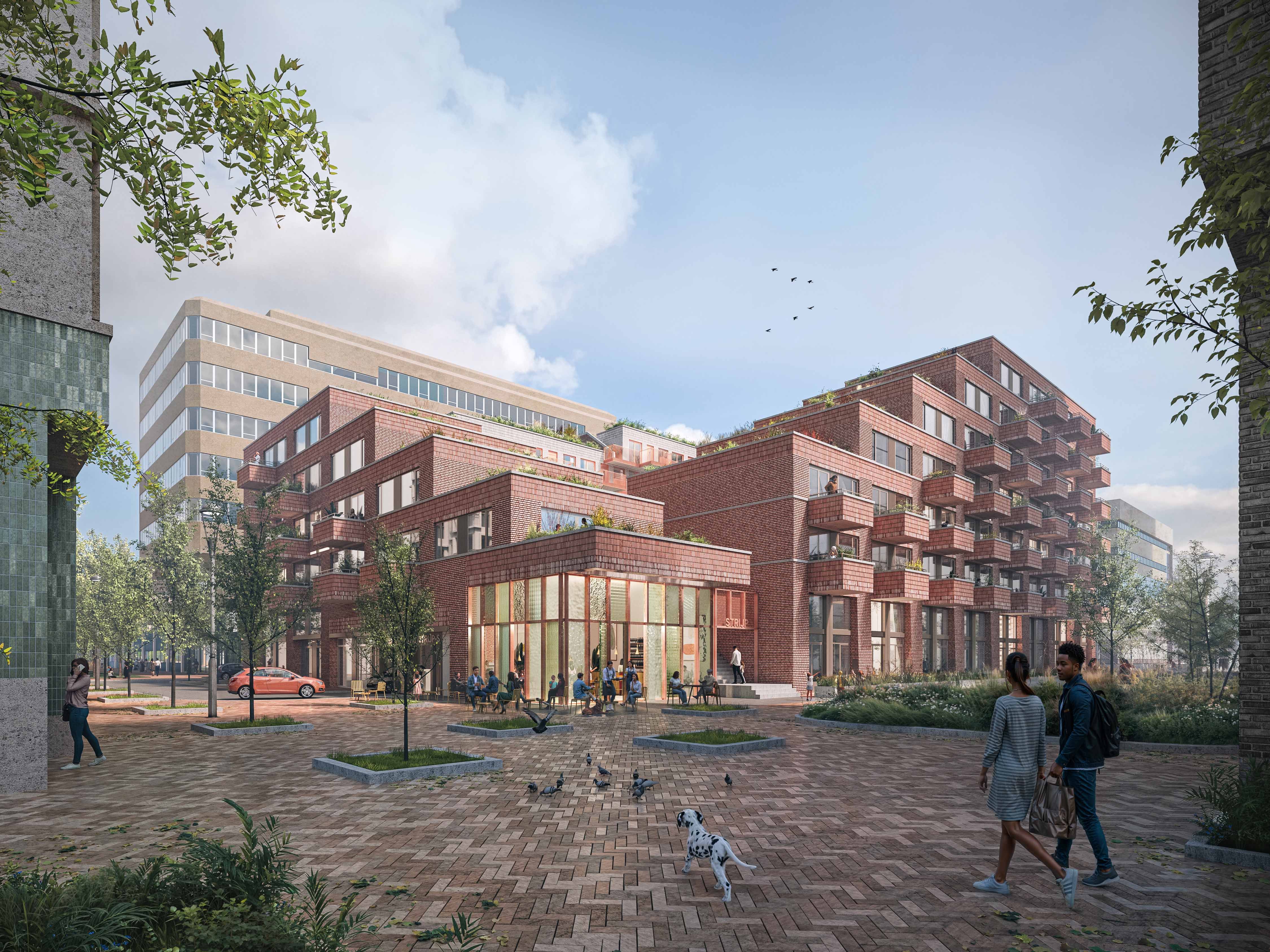 De onderste bouwlagen bieden plaats aan klassieke doorzon-maisonnettes, voor gezinnen, met een voortuintje aan de straat en een achtertuin aan de rustige binnentuin. Onder het complex wordt op twee lagen geparkeerd. Commerciële ruimten op de hoeken verlevendigen de interactie met de straat. De glazen plint ligt rondom iets terug; de dubbelhoge penanten zijn uitgevoerd in een lichtgekleurde, iets bonte baksteen.