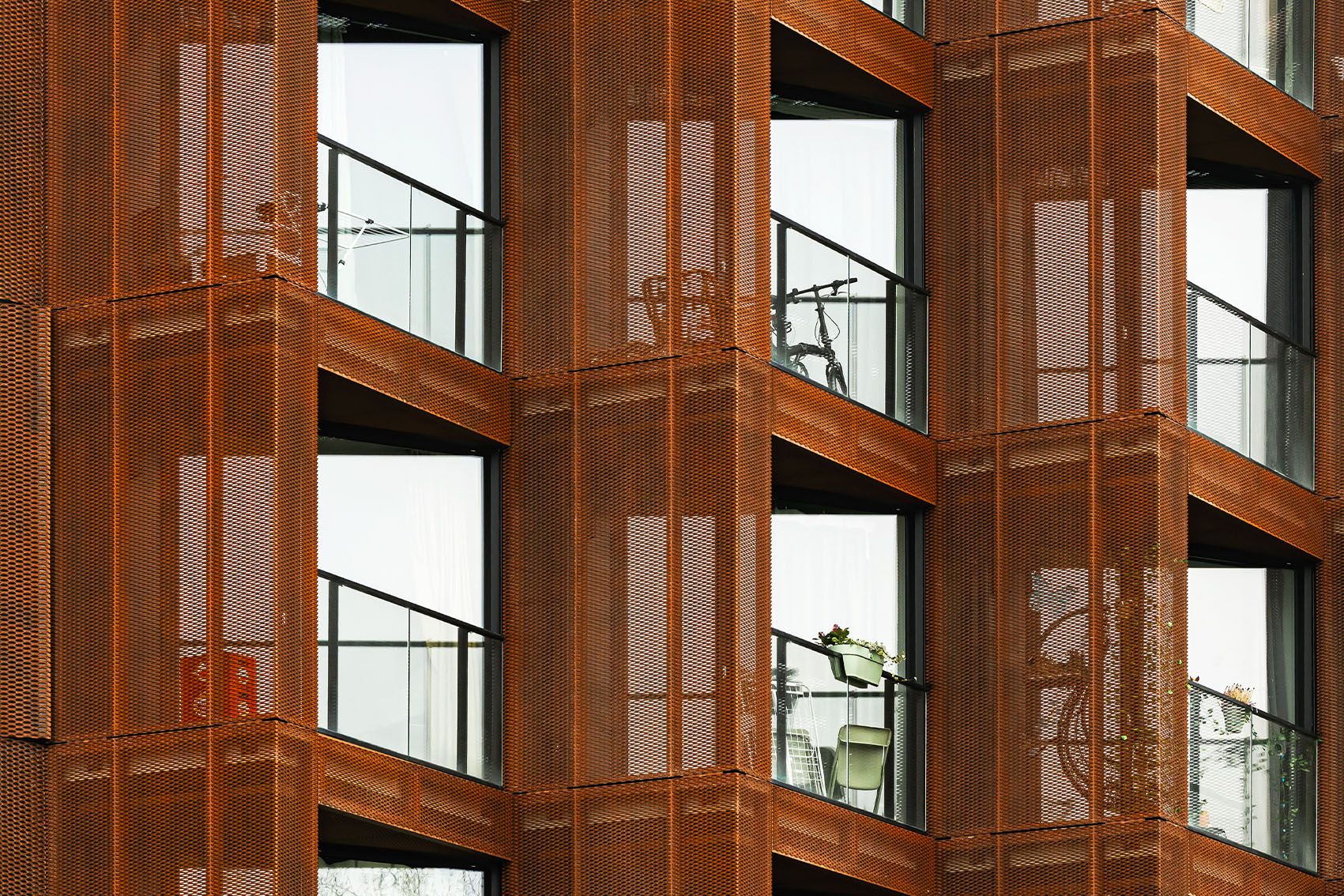 De gevels van houtskeletbouw zijn omhuld met roestkleurig strekmetaal, uitgevoerd in twee maaswijdtes en toegepast in twee richtingen. In de grove kartels bevinden zich de balkons, gericht op het zuiden en dus op de zon, met zicht op het Wisselspoorpark en op het centrum van Utrecht. Eronder zijn nestkasten ingepast.