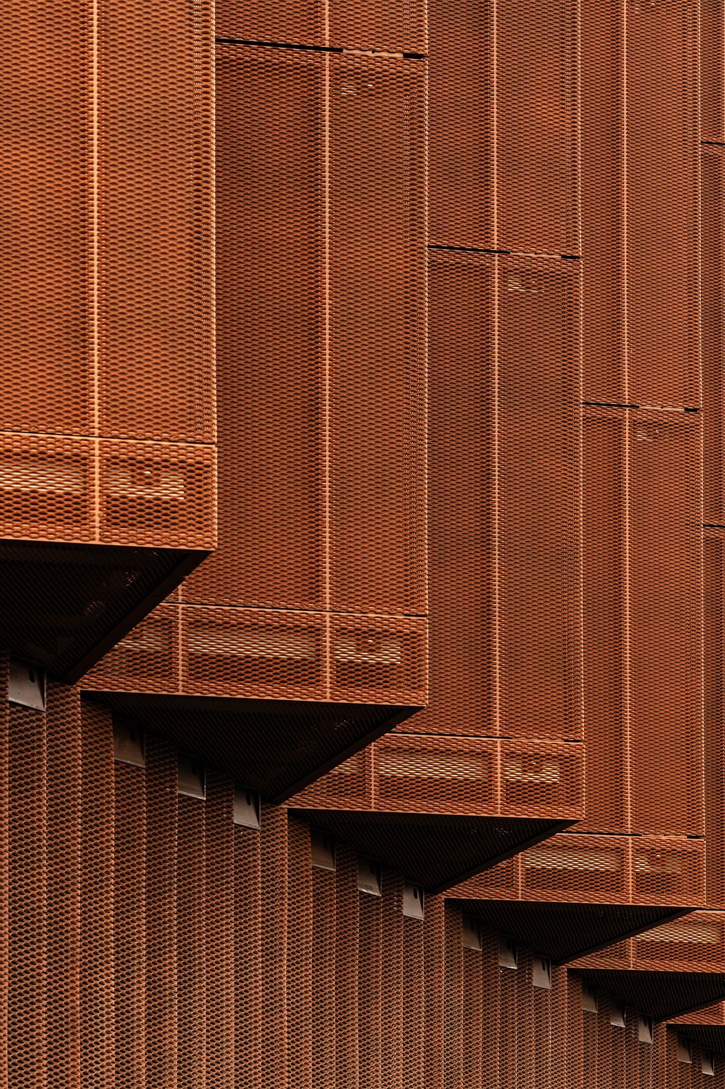 De verticale zaagtand-gevel is geïnspireerd op de sheddaken van de Wagenmakerij. De huid is gemaakt van strekmetaal in een roestachtige kleur; ook de betonnen plinten van het gebouw krijgen deze kleur.