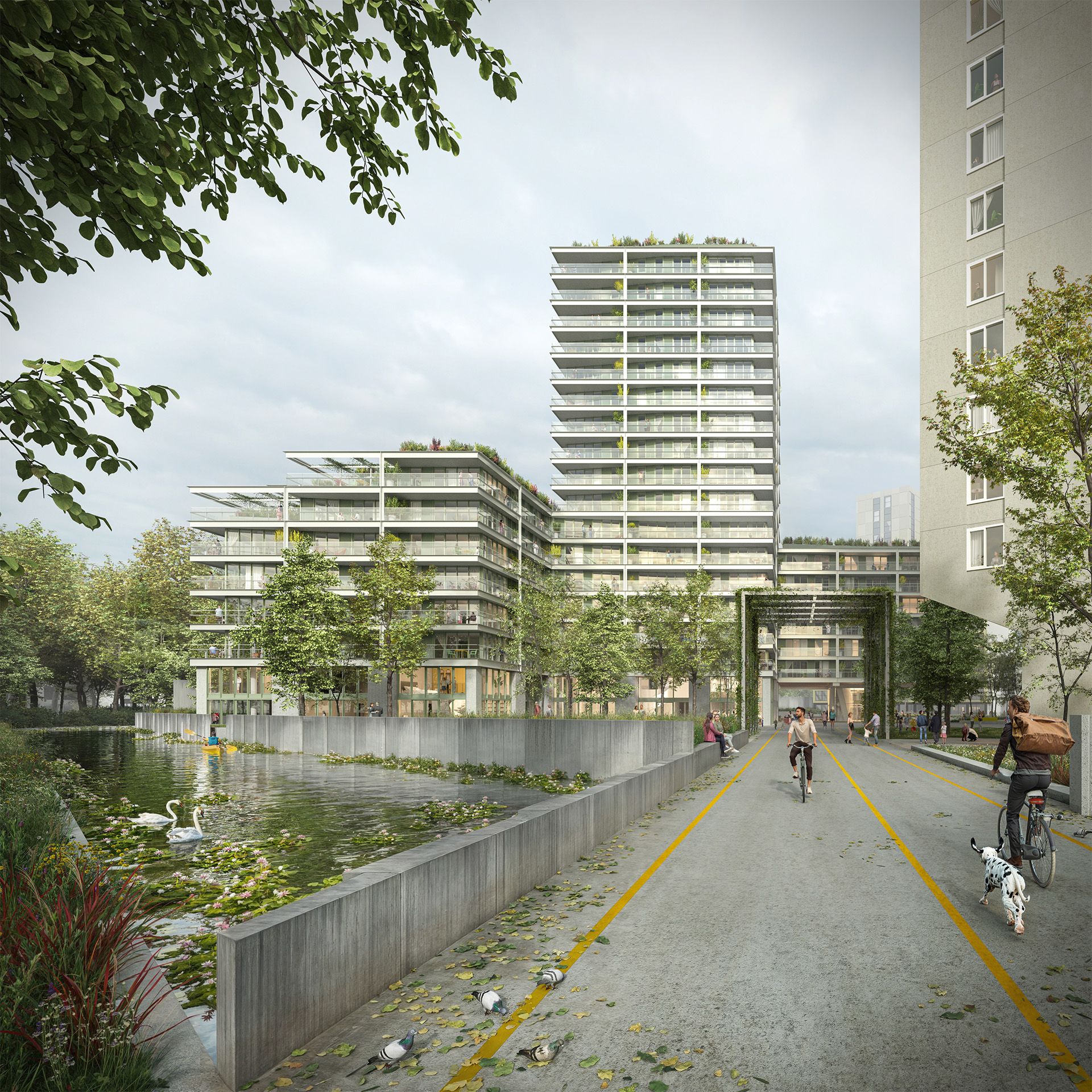 Het half-verdiept, onder het blok, stallen van fietsen tilt het hele woonblok iets op. De woningen op de begane grond hebben daarmee wat afstand tussen binnen en openbaar groen, een ‘Hochparterre’, gemarkeerd met langgerekte traptreden. Straks in het voorjaar ook een prima buitenzitje aan het park.