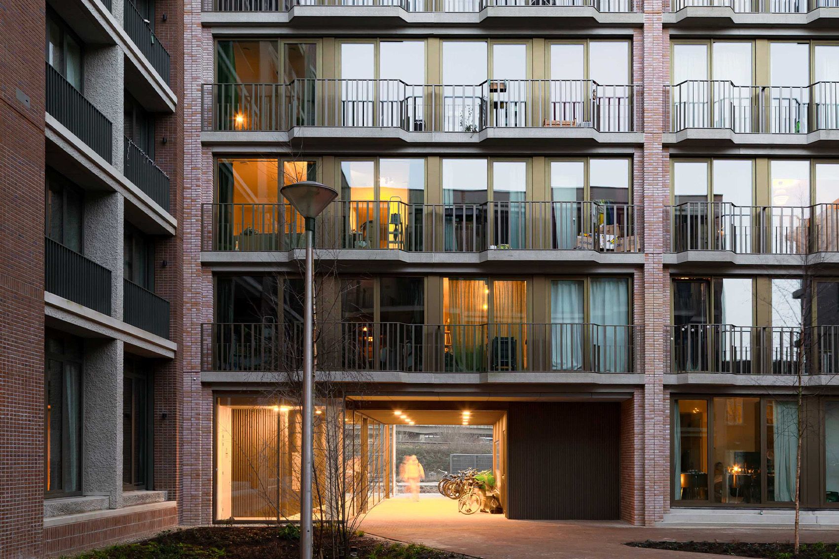 Aan de overzijde van het blok, in bouwdeel De Koploper, hebben we een tweede poort gecreëerd. Een ruime uitsparing in het gebouw maakt de overgang tussen het publieke park en de intieme tuin. Visueel kadreert de poort de blik op het hof, en, omgekeerd, op het park met daarachter de beweging van de treinen. Bewust liggen de entrees van alle woningen in deze poort. Dat brengt bewoners samen en maakt van de schakel tussen publiek en privé een levendige ontmoetingsplek. De maat, de materialisatie en vooral de transparantie ervan maakt de ervaring intiem, veilig en uitnodigend.