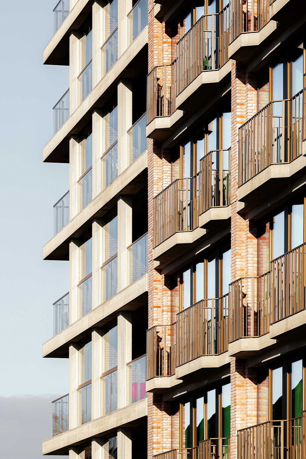 In de herontwikkeling van Wisselspoor van railindustrie naar ‘stoer stukkie stad’, worden de gebouwen van noord naar zuid geleidelijk groter. Van contrastrijke, individuele woningen naar forser volumes. In het zuidelijk deel blijft de omvangrijke hal van de Wagenmakerij behouden; de nieuwbouw hieromheen is eveneens robuust. Het stadsblok ernaast, Wisselspoor 9, bestaat uit vier bouwdelen, duidelijk afleesbaar maar met een gemeenschappelijke taal. Door de materialisatie van de gevels – betonnen banden en baksteen – vormen ze een eenheid. Voor de bouwdelen De Koploper en De Machinist kozen we voor baksteen in een zachte kleur en voor balkonhekken en kozijnen in een warme tint brons.