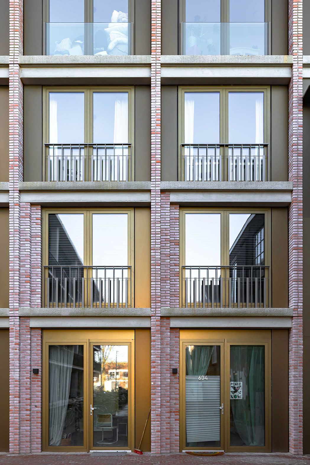Alle studentenkamers hebben een eigen balkon. De balkons variëren in diepte, voor afwisseling in zonlicht-toetreding. Het hekwerk heeft lamellen in twee hoogtes en geplaatst in twee richtingen om inkijk te doseren bij zo royaal mogelijk uitzicht.